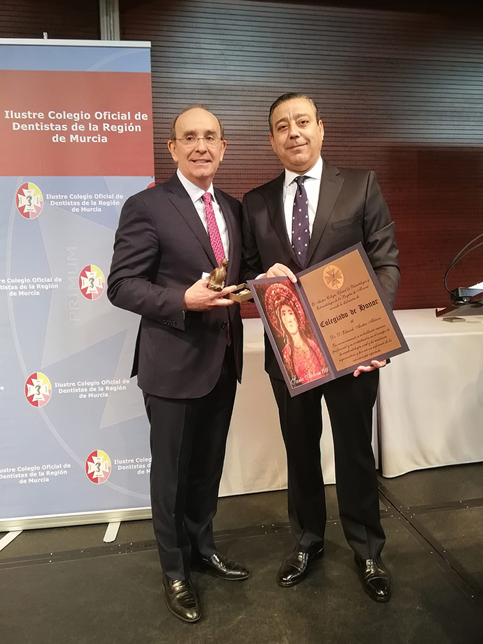 El Ilustre Colegio Oficial de Dentistas de Murcia ha nombrado Colegiado de Honor al doctor Eduardo Anitua “por su dilatada y brillante carrera profesional, por ser un referente en la Odontología española, y por su contribución al frente de su Fundación mediante la investigación en el campo de la implantología oral y la medicina regenerativa”. El citado nombramiento fue entregado en el trascurso de la gala de Santa Apolonia este 9 de febrero de 2019.